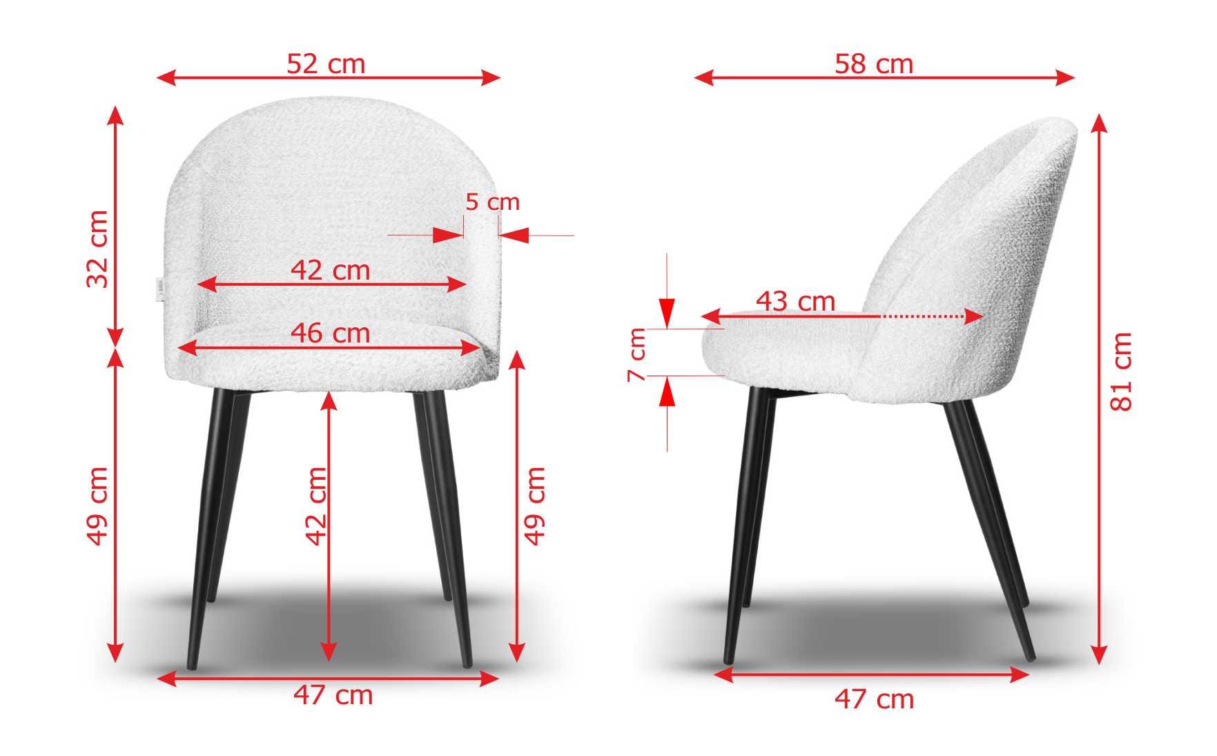 Model Soul łączy prostą, nowoczesną formę z subtelną elegancją. Tapicerowane siedzisko i oparcie wykonane są z wysokiej jakości tkaniny typu boucle, która zachowuje estetyczny wygląd nawet przy codziennym użytkowaniu. Smukłe nogi z lustrzanego metalu nadają lekkości konstrukcji i podkreślają minimalistyczny charakter mebla. Całość tworzy harmonijne połączenie stylu, wygody i solidności.