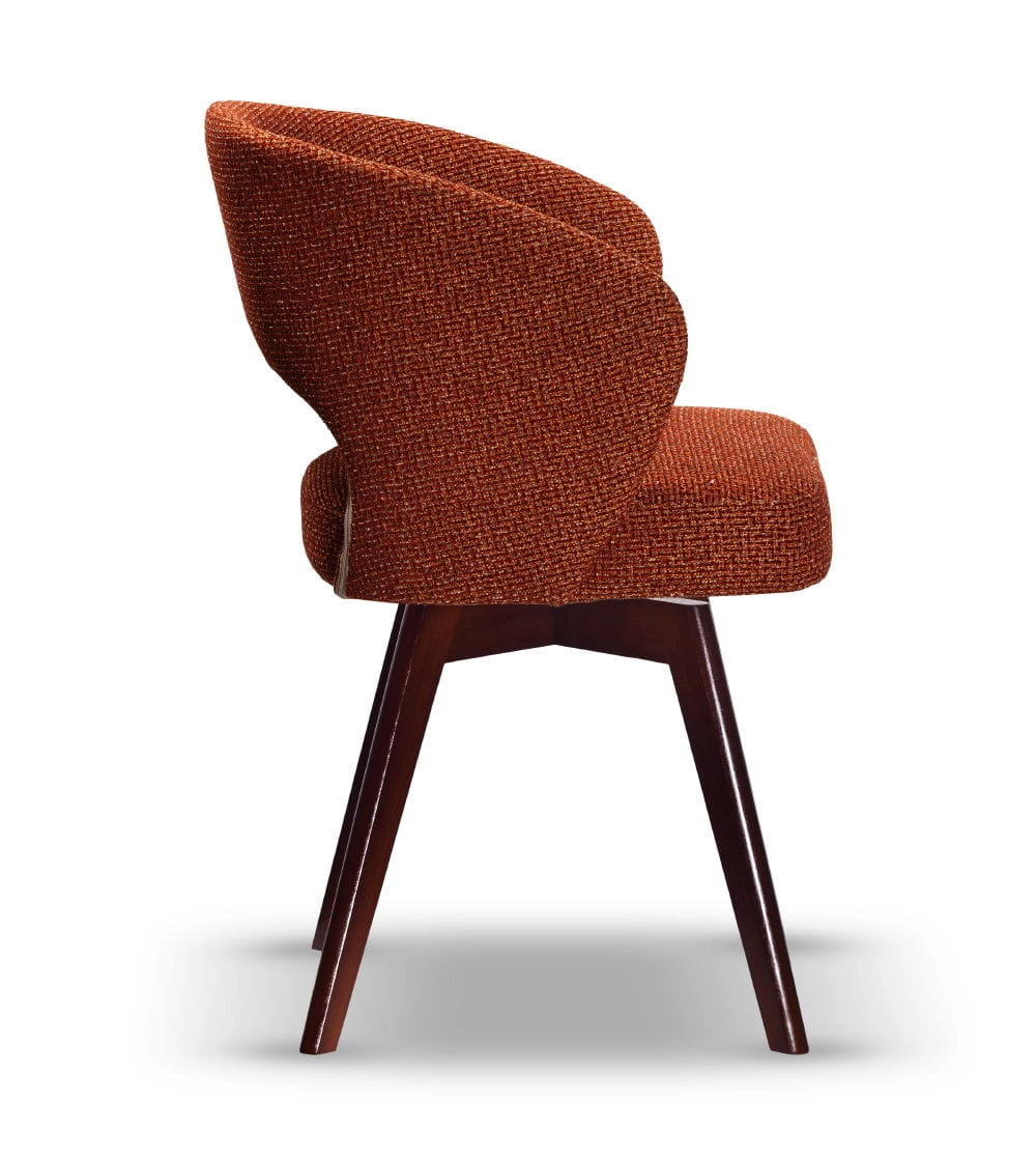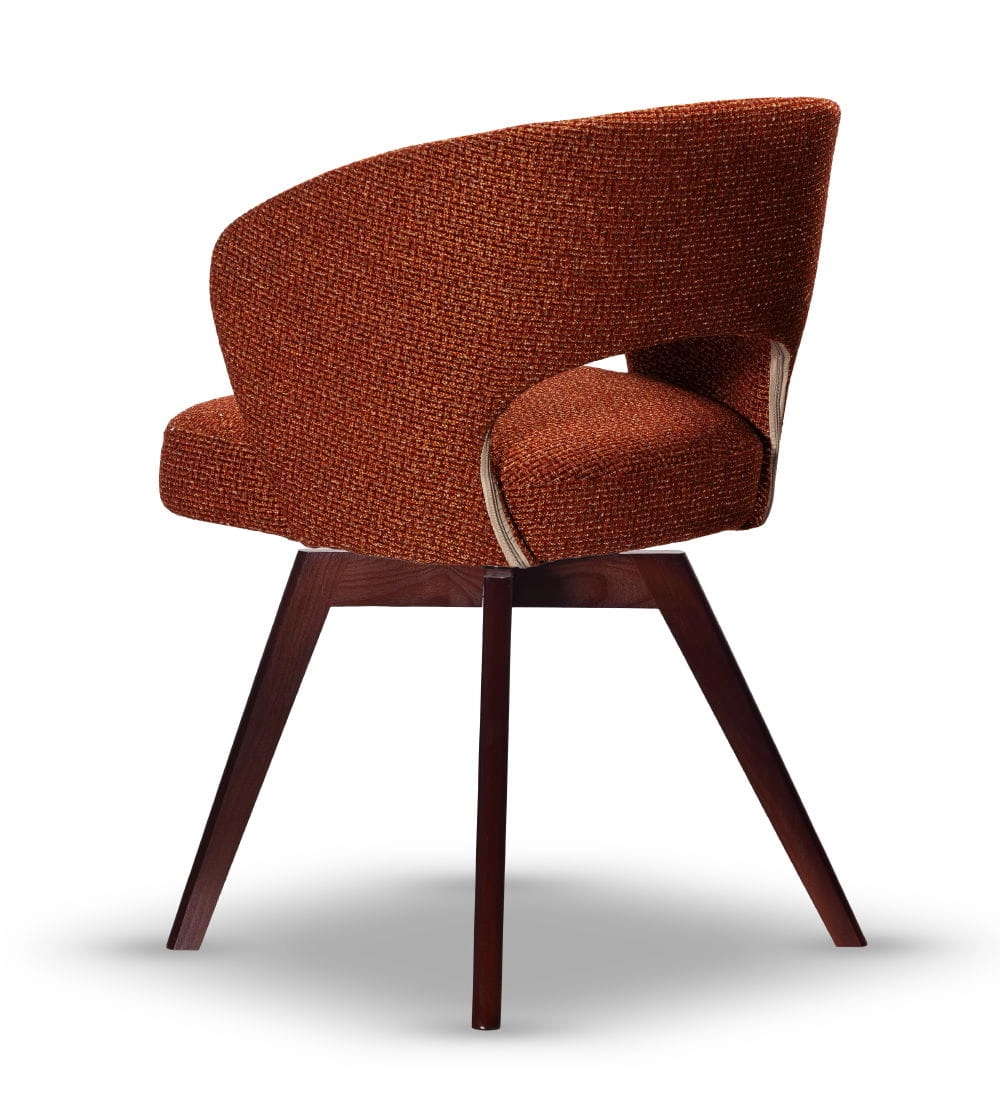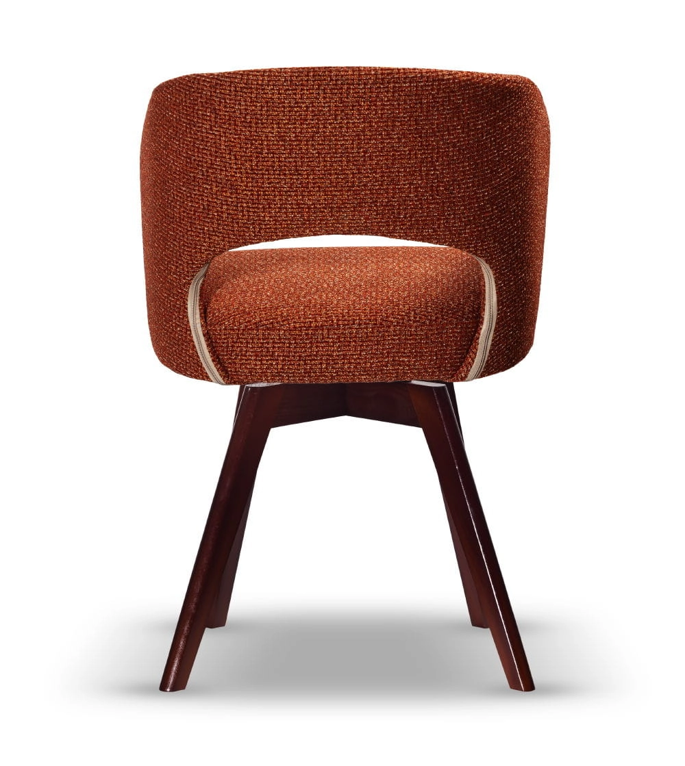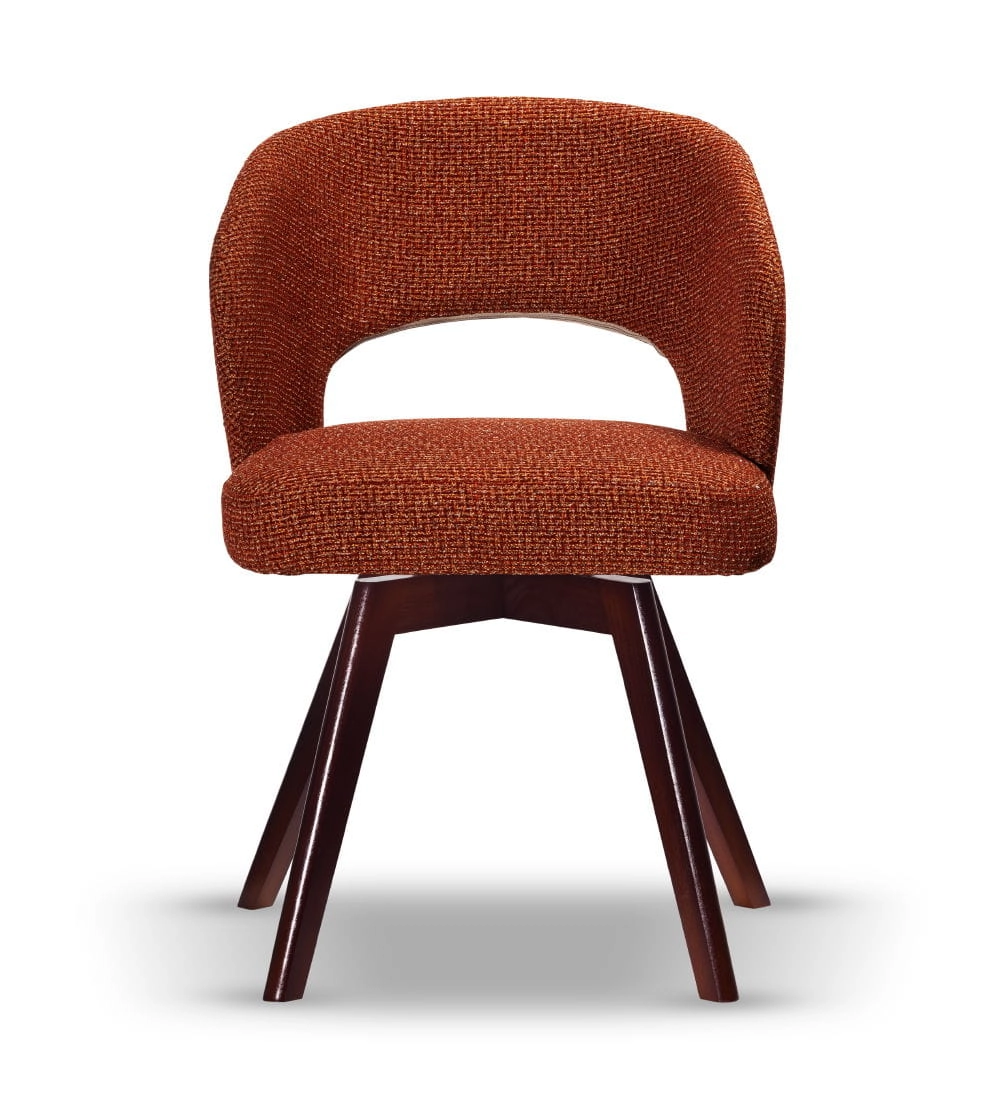Model Carlo Personalizowany łączy w sobie nowoczesność, prostotę i wygodę. Subtelne oparcie i miękkie siedzisko tapicerowane wybraną tkaniną tworzą harmonijną całość. Smukłe nogi drewniane w kolorze orzechowym podkreślają minimalistyczny design, jednocześnie zapewniając solidną stabilność, a funkcja obrotowego siedziska, zwiększa komfort użytkowania. Całość wykonana jest z wysokiej jakości materiałów – odporna na codzienne użytkowanie, zachowuje estetyczny wygląd przez wiele lat.