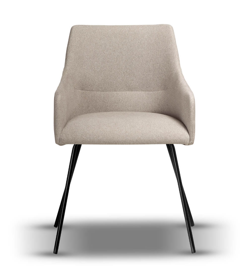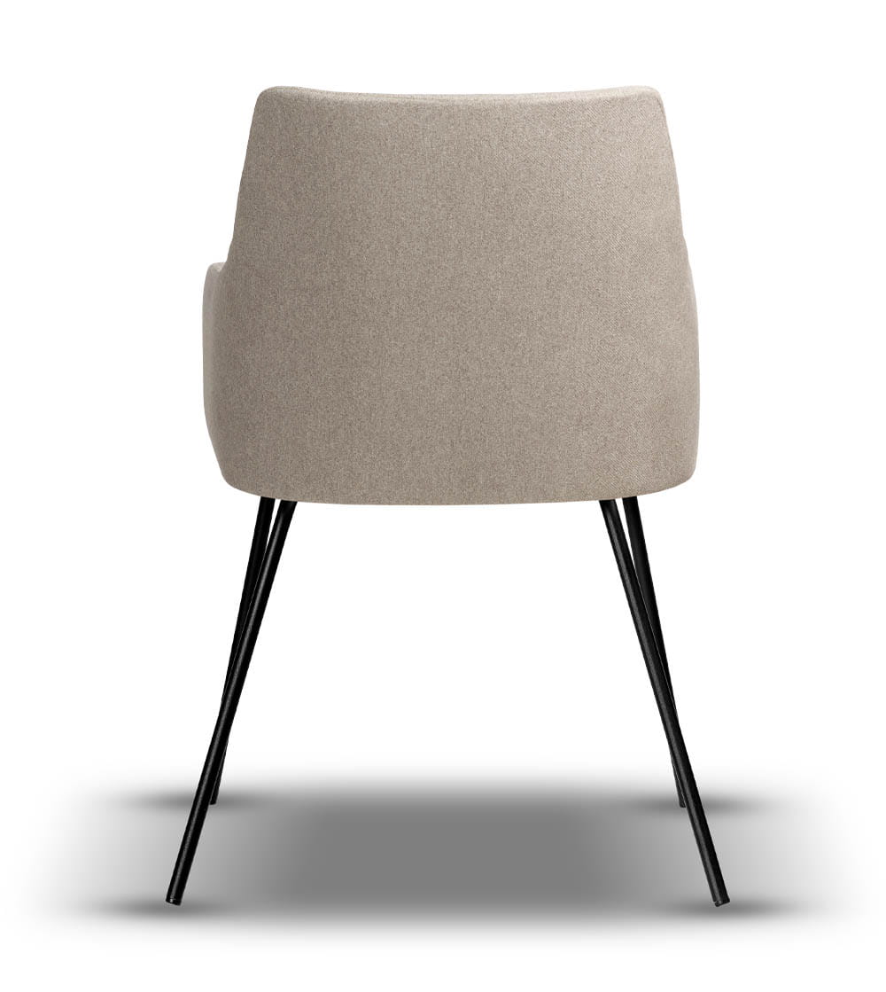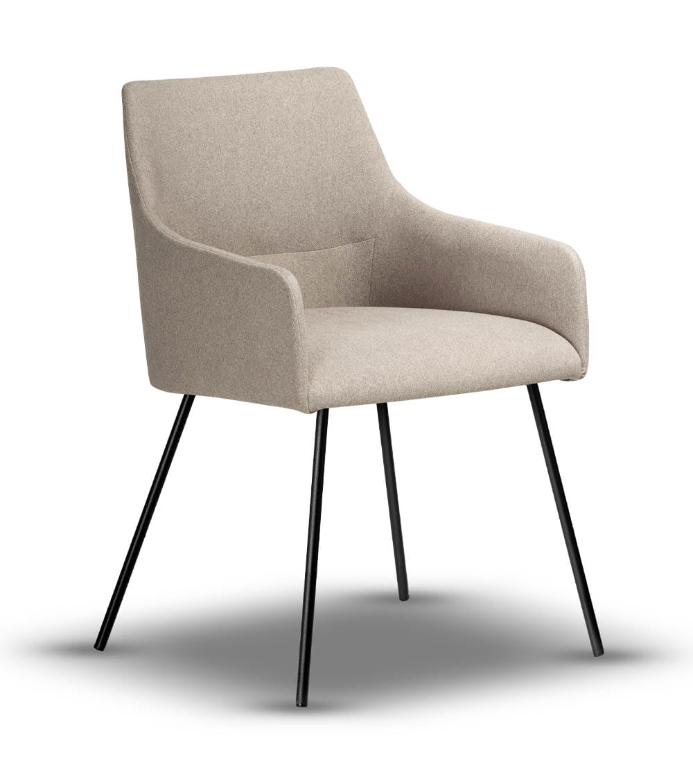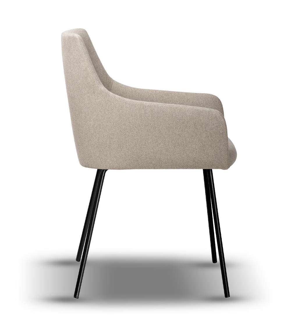 Model Vigo-2 łączy prostą, nowoczesną formę z funkcjonalnością. Tapicerowane siedzisko wykonane jest z wysokiej jakości tkanin, które zachowują estetyczny wygląd nawet przy codziennym użytkowaniu. Smukłe nogi z czarnego metalu nadają lekkości konstrukcji i podkreślają minimalistyczny charakter mebla. Całość tworzy harmonijne połączenie stylu, wygody i solidności. Stylowe i wygodne podłokietniki dopełniają formę krzesła oraz idealnie wpasowując się do wielu aranżacji