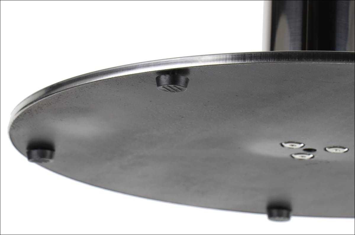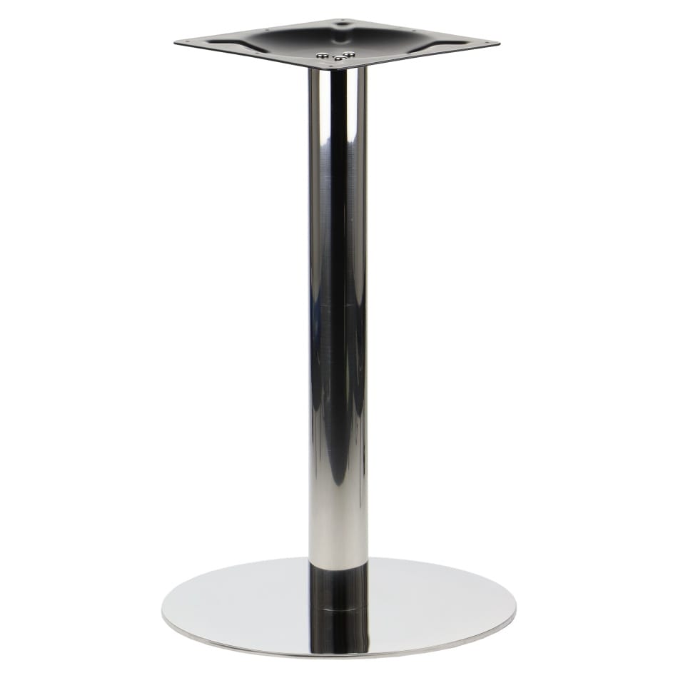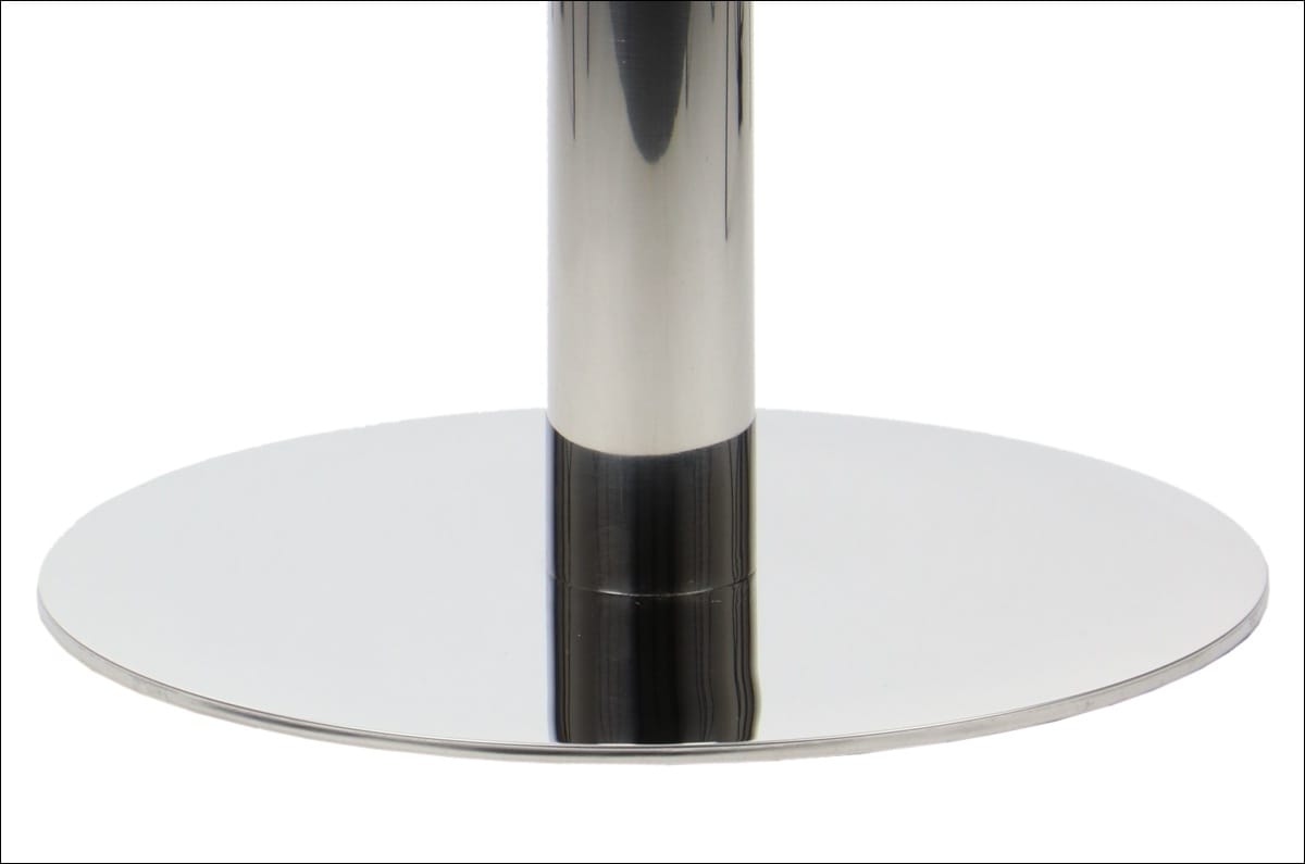 Dolny element podstawy SH-3001-5/P to koło o średnicy 44,5 cm wykonane ze stali i blachy nierdzewnej polerowanej. Noga ze stali nierdzewnej połączona została z elementem przeznaczonym do montażu blatu, który wykonano z blachy tłoczonej. Dzięki regulowanym stopkom podstawę można łatwo wypoziomować. Produkt przeznaczony jest do samodzielnego montażu.