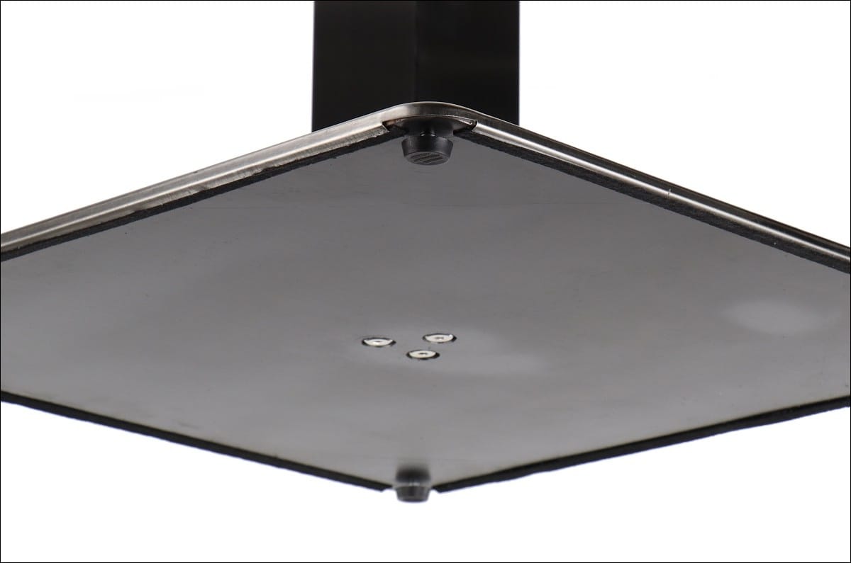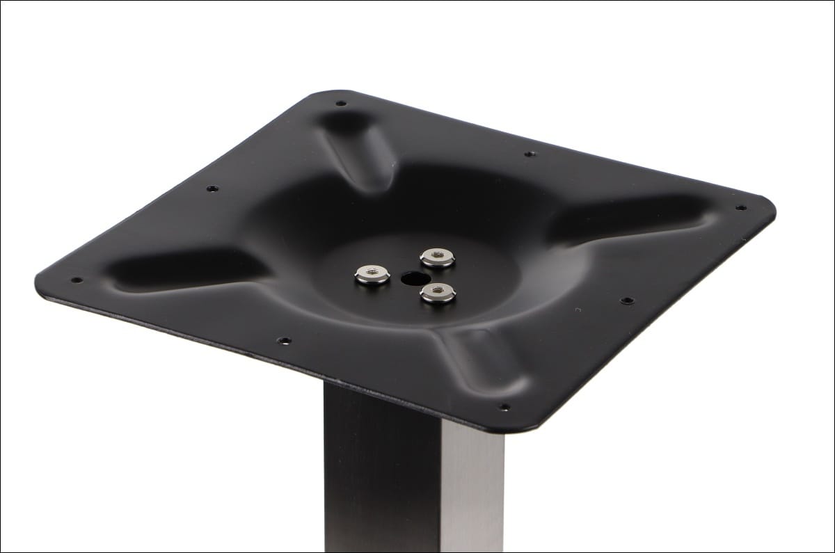 Dolny element podstawy SH-3002-1/60/S wykonano ze stali, pokrytej dodatkowo blachą nierdzewną szczotkowaną. Noga wykonana ze stali nierdzewnej połączona jest z elementem górnym, przeznaczonym do montażu blatu, który montuje się za pomocą 8 otworów montażowych o średnicy 5 mm. Dzięki regulowanym stopkom podstawę można łatwo wypoziomować. Produkt przeznaczony jest do samodzielnego montażu.