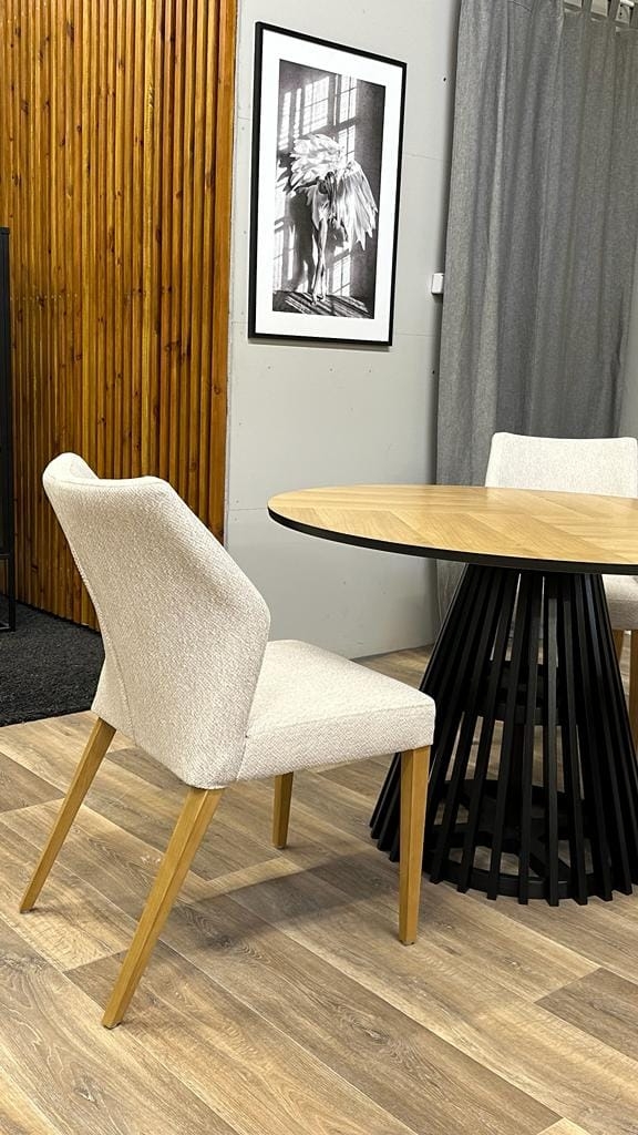 Model Fox łączy prostą, nowoczesną formę z funkcjonalnością. Tapicerowane siedzisko i oparcie wykonane są z wysokiej jakości tkanin, które zachowują estetyczny wygląd nawet przy codziennym użytkowaniu. Smukłe nogi z drewna bukowego nadają lekkości konstrukcji i podkreślają minimalistyczny charakter mebla. Całość tworzy harmonijne połączenie stylu, wygody i solidności.